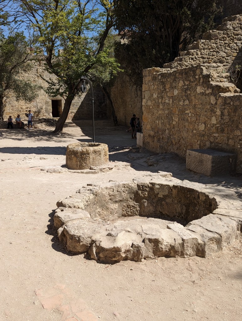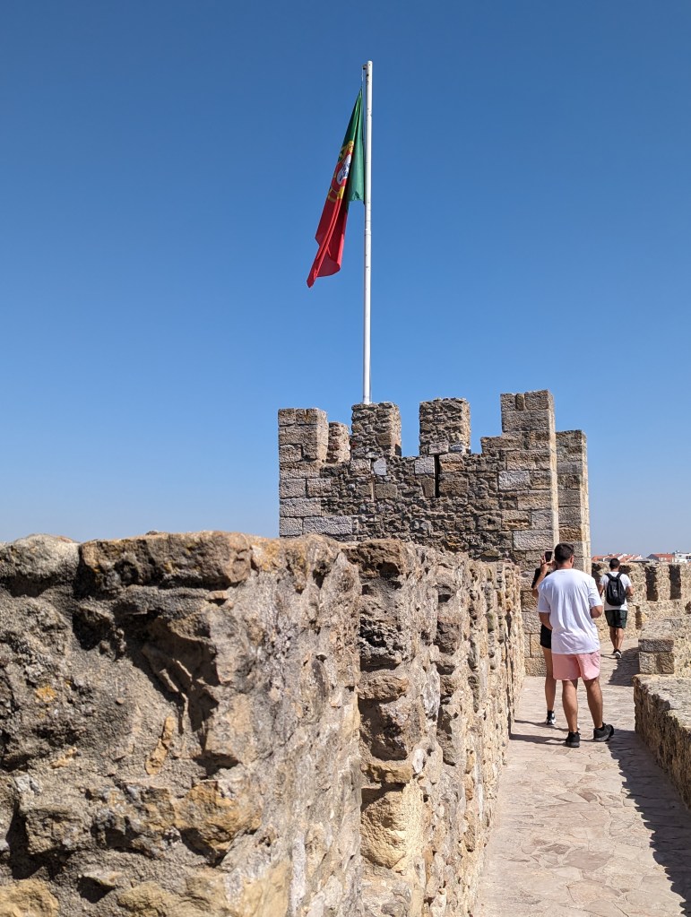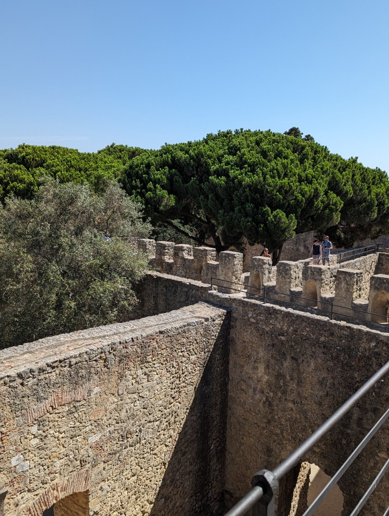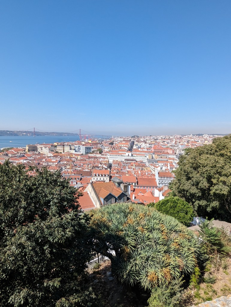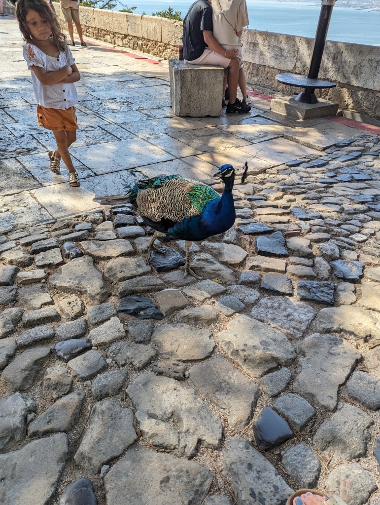 View from Castle St. Jorge (St. George and the Dragon)It was such a steep hike I don’t know how this castle could be easily seized.Peacocks roam the Castle grounds.And all up in the trees. Walk thru being aware of that.Multiple fountains and baths meaning they seemed to have plenty of water within the grounds.